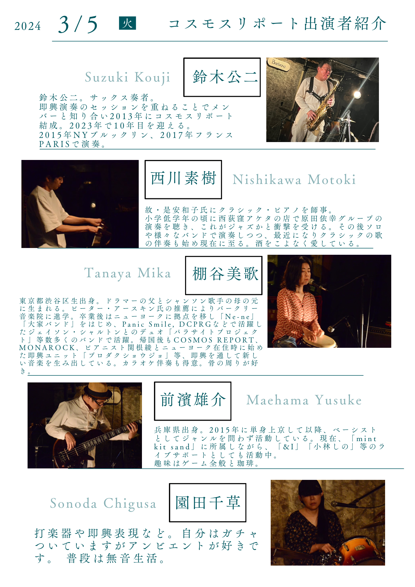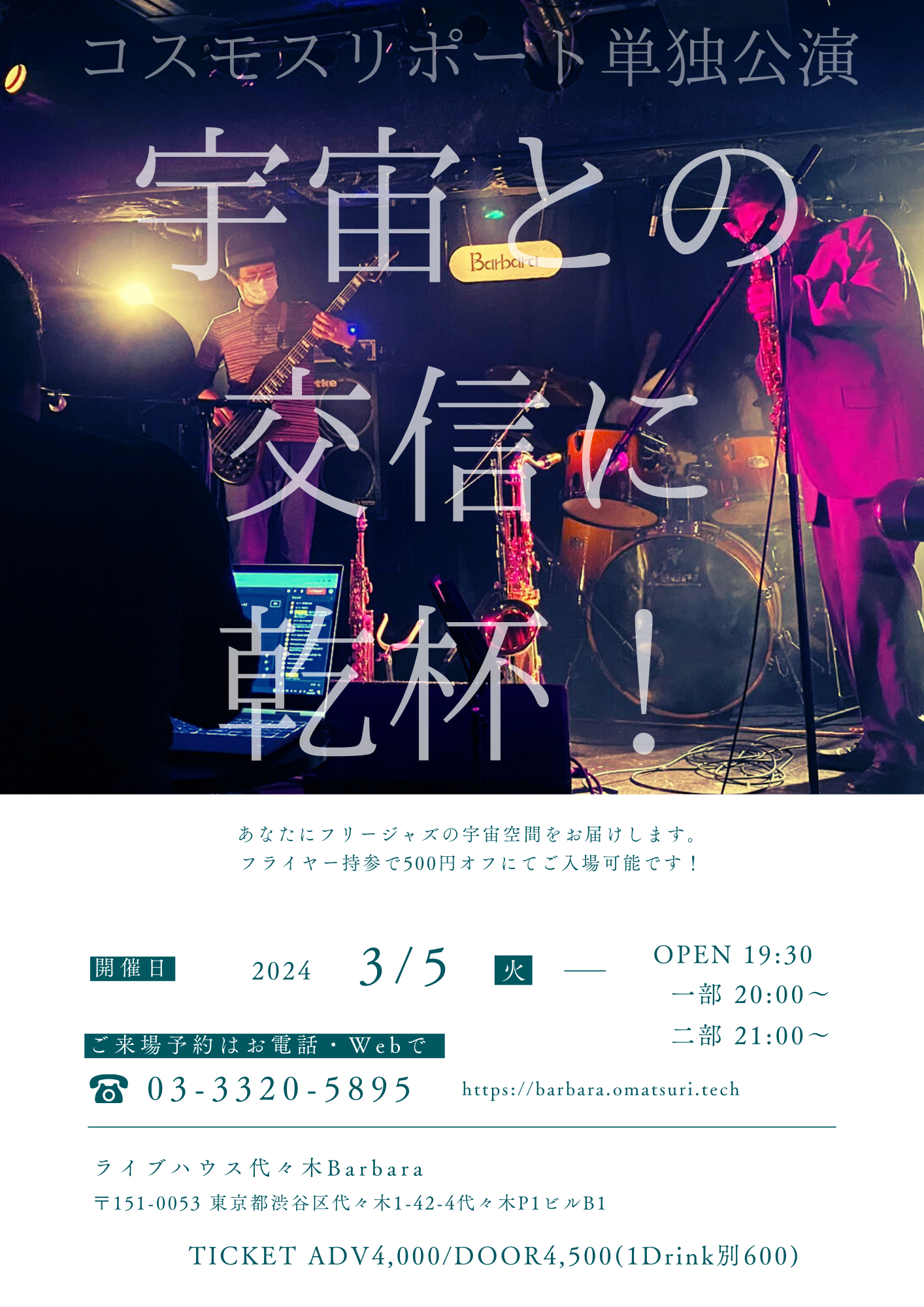 2024.03.05 コスモリポート単独公演「宇宙との交信に乾杯!vol.72」 OPEN/START 19:30/20:00 ADV/DOOR 4000/4500(1Drink600) ※フライヤー持参で500円オフ!