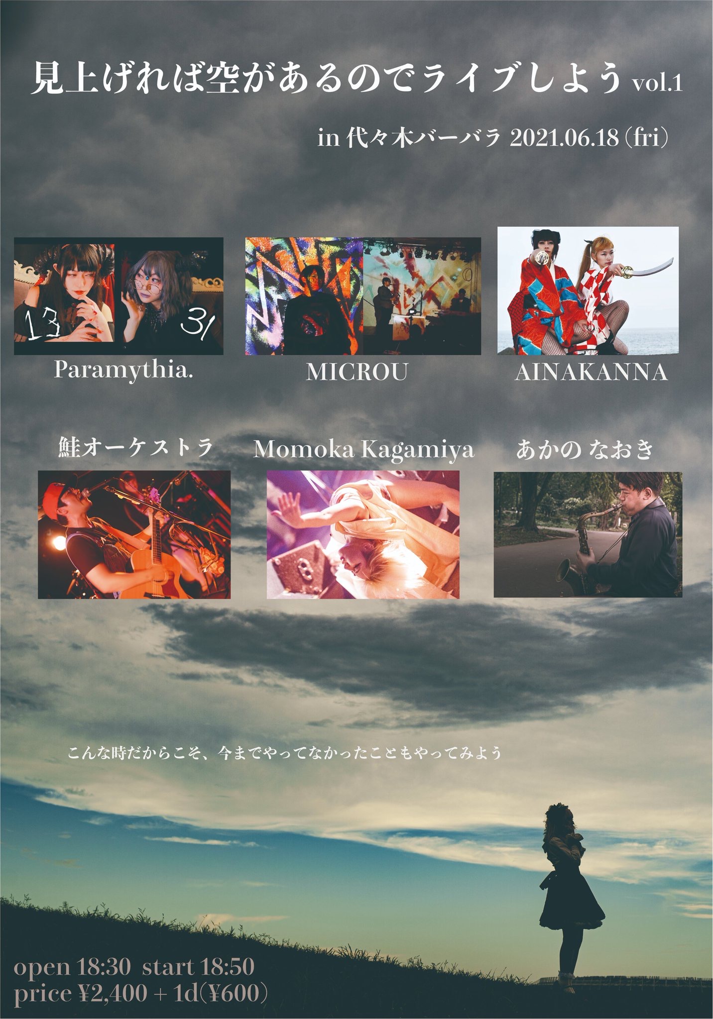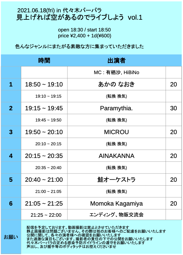出演者 Paramythia. MICROU AINAKANNA 鮭オーケストラ Momoka Kagamiya あかのなおき OPEN 18:30 / START 18:50 Ticket 2,400