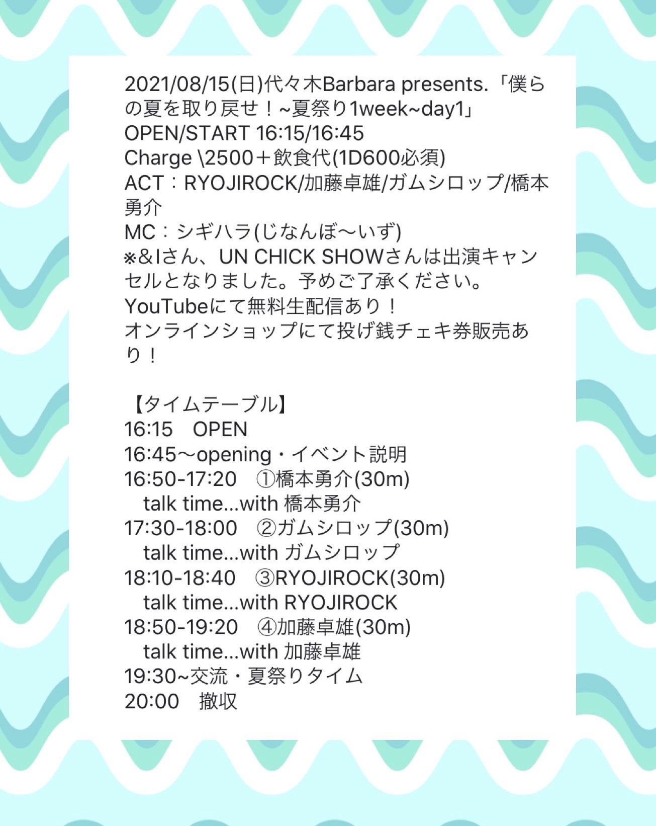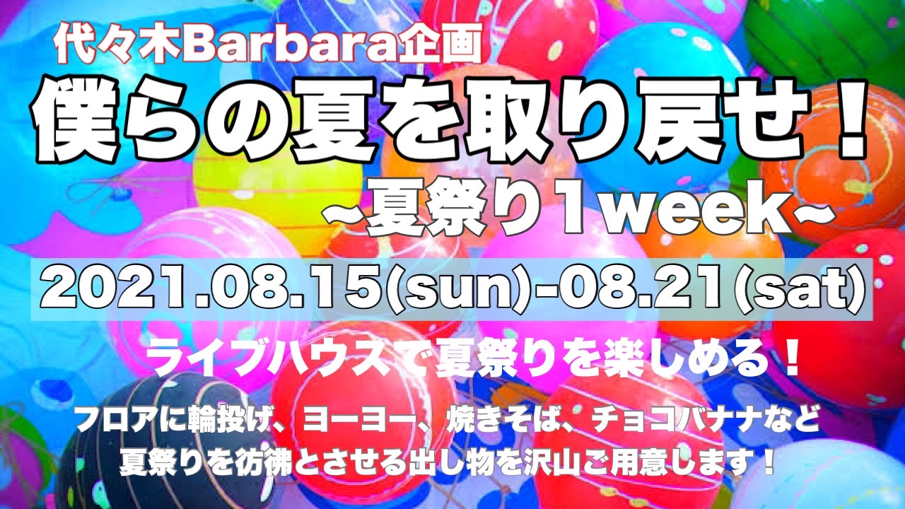 2021/08/15(日)代々木Barbara presents.「僕らの夏を取り戻せ!~夏祭り1week~day1」