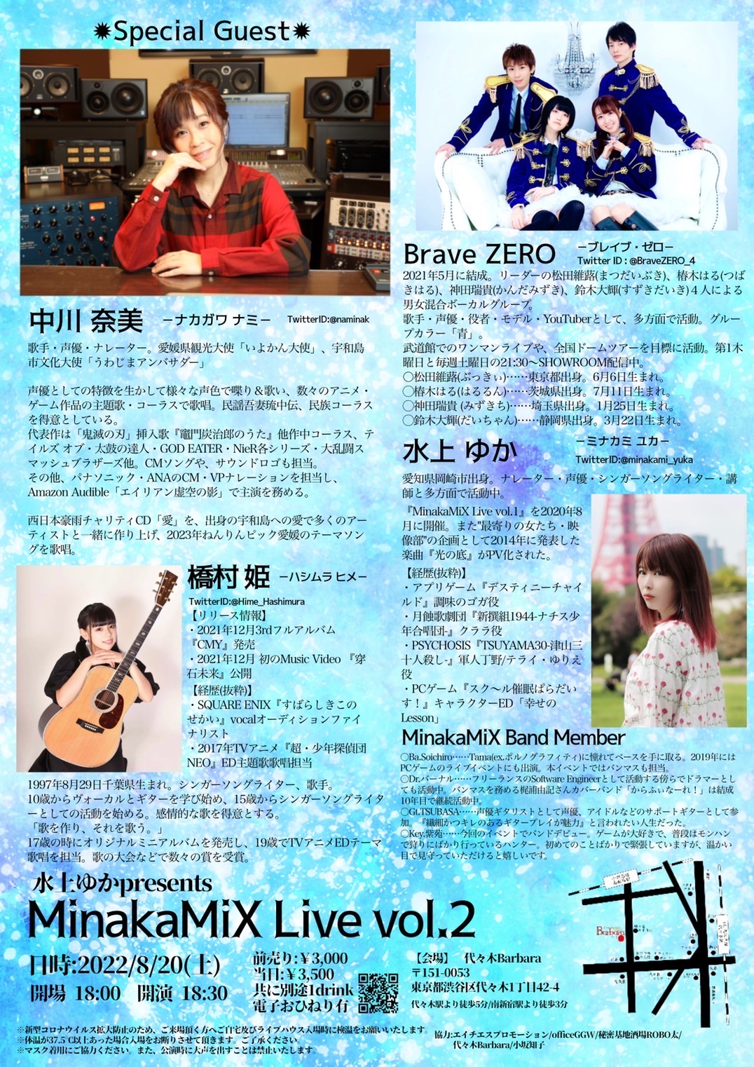 2022/08/20(Sat)「MinakaMix Live Vol.2」 OPEN/START 18:00/18:30 前売/当日 3,000/3,500(1D別600) ACT:水上ゆか/橋村姫/Brave ZERO Special GUEST:中川奈美