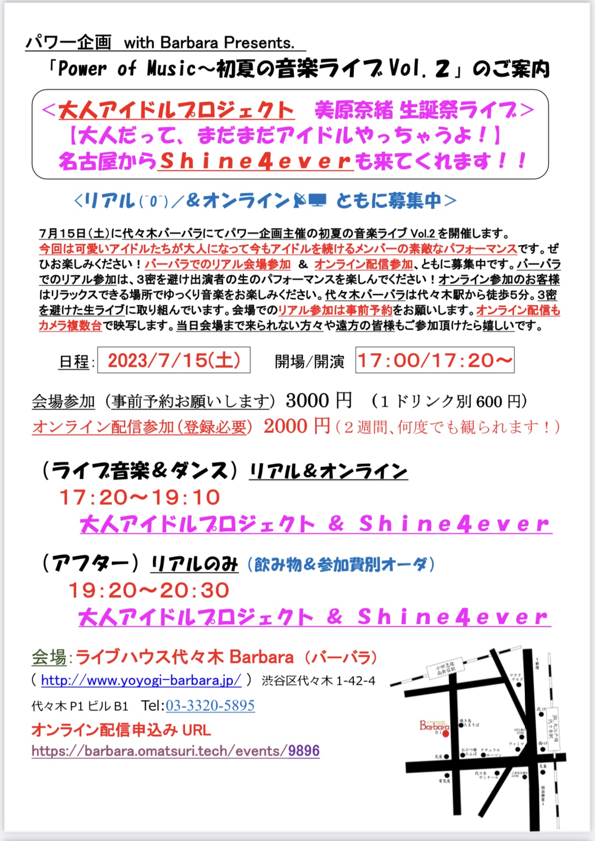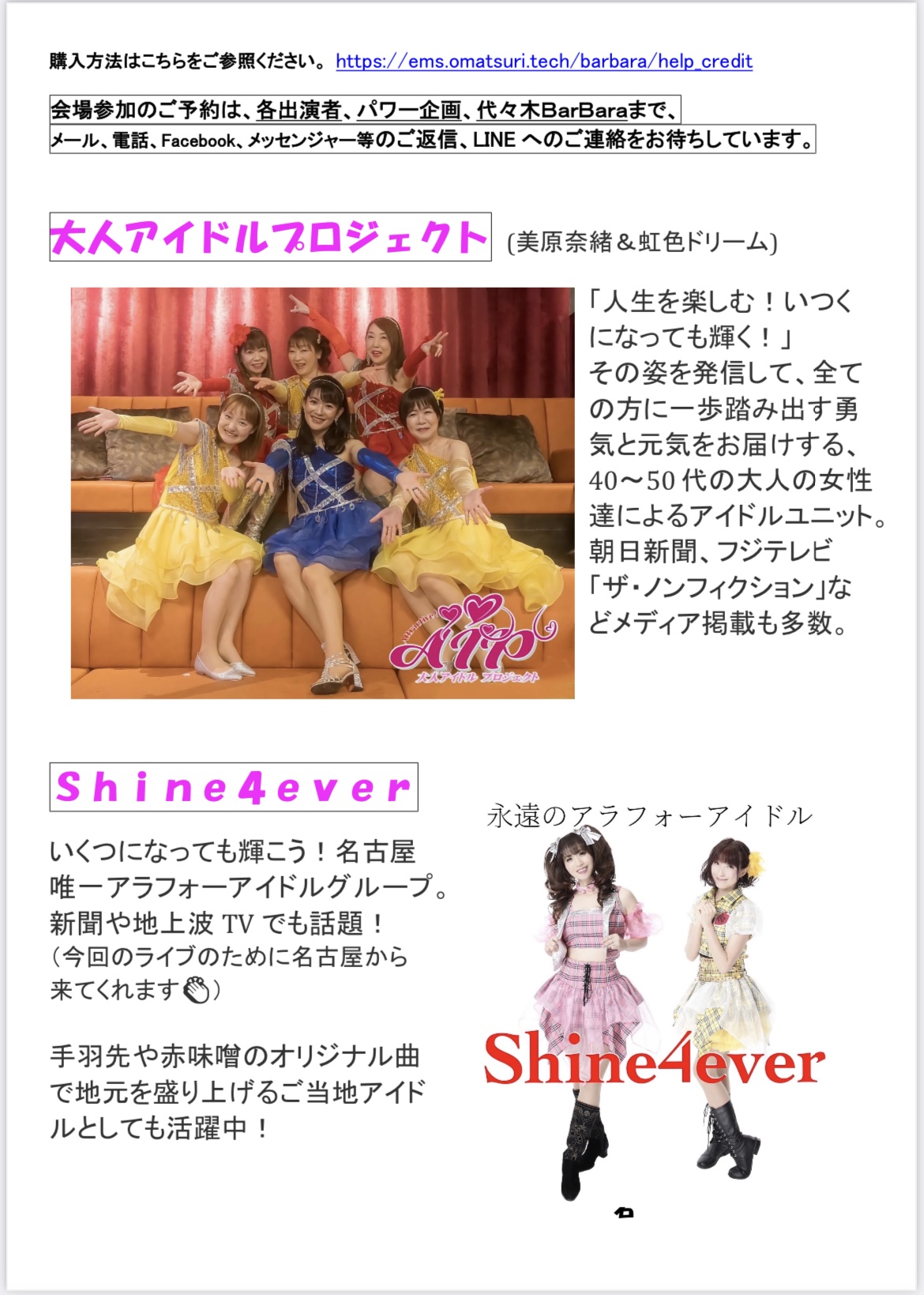 出演者 大人アイドルプロジェクト Shine4ever パワー企画 OPEN 17:00 / START 17:20 TICKET 3,000/配信2,000